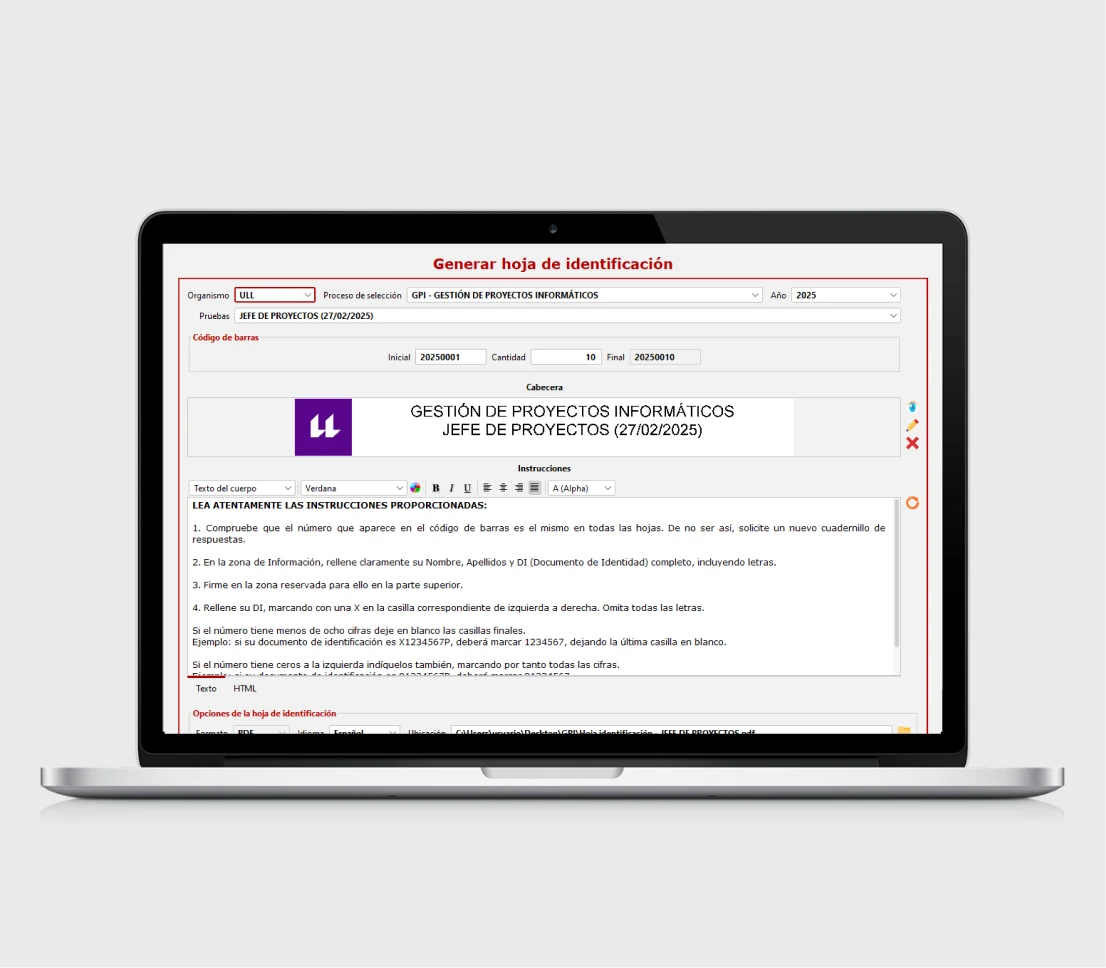 - Generar las hojas de identificación con cabecera e instrucciones personalizadas