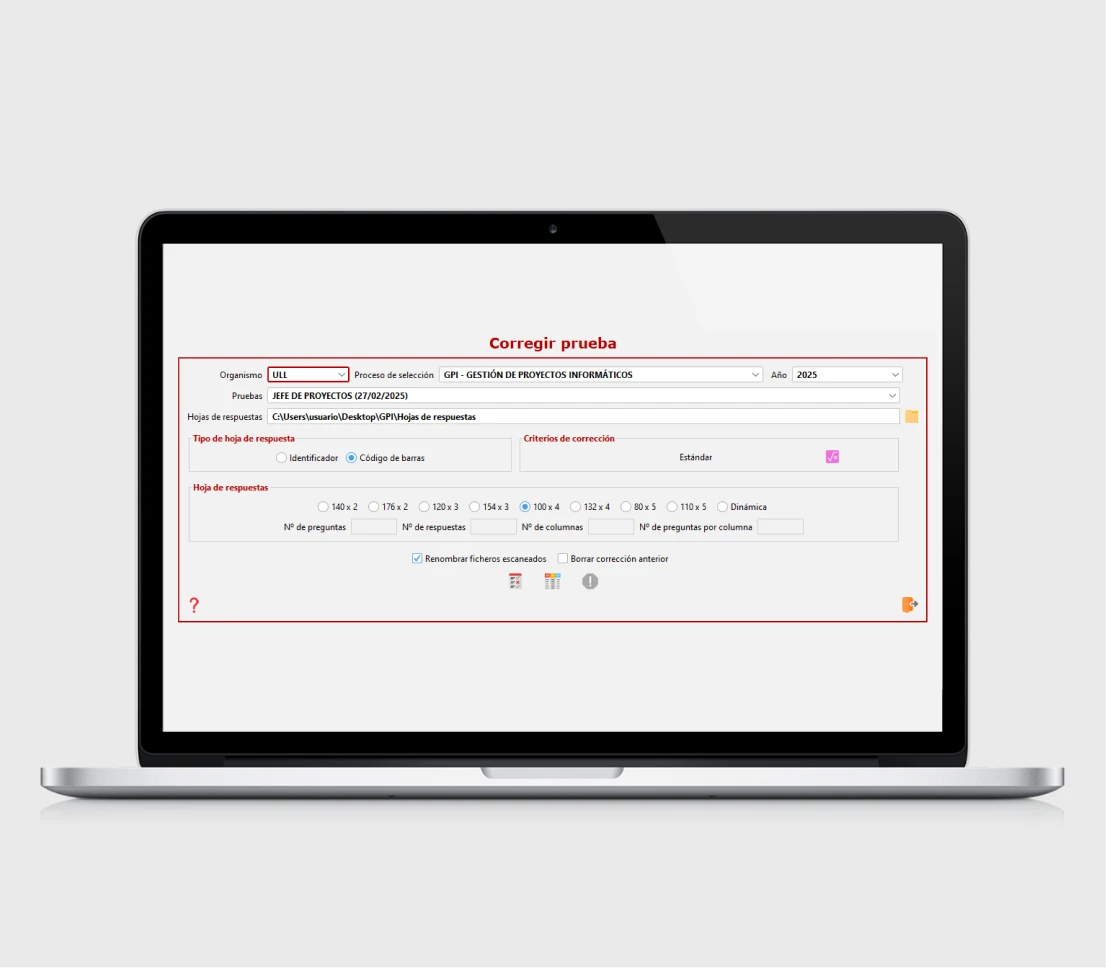- Corregir la prueba a partir de las hojas de respuestas escaneadas (se puede seguir trabajando sin esperar a que termine la corrección)