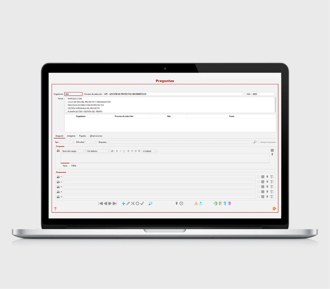 - Gestión de preguntas de tipo test y desarrollo